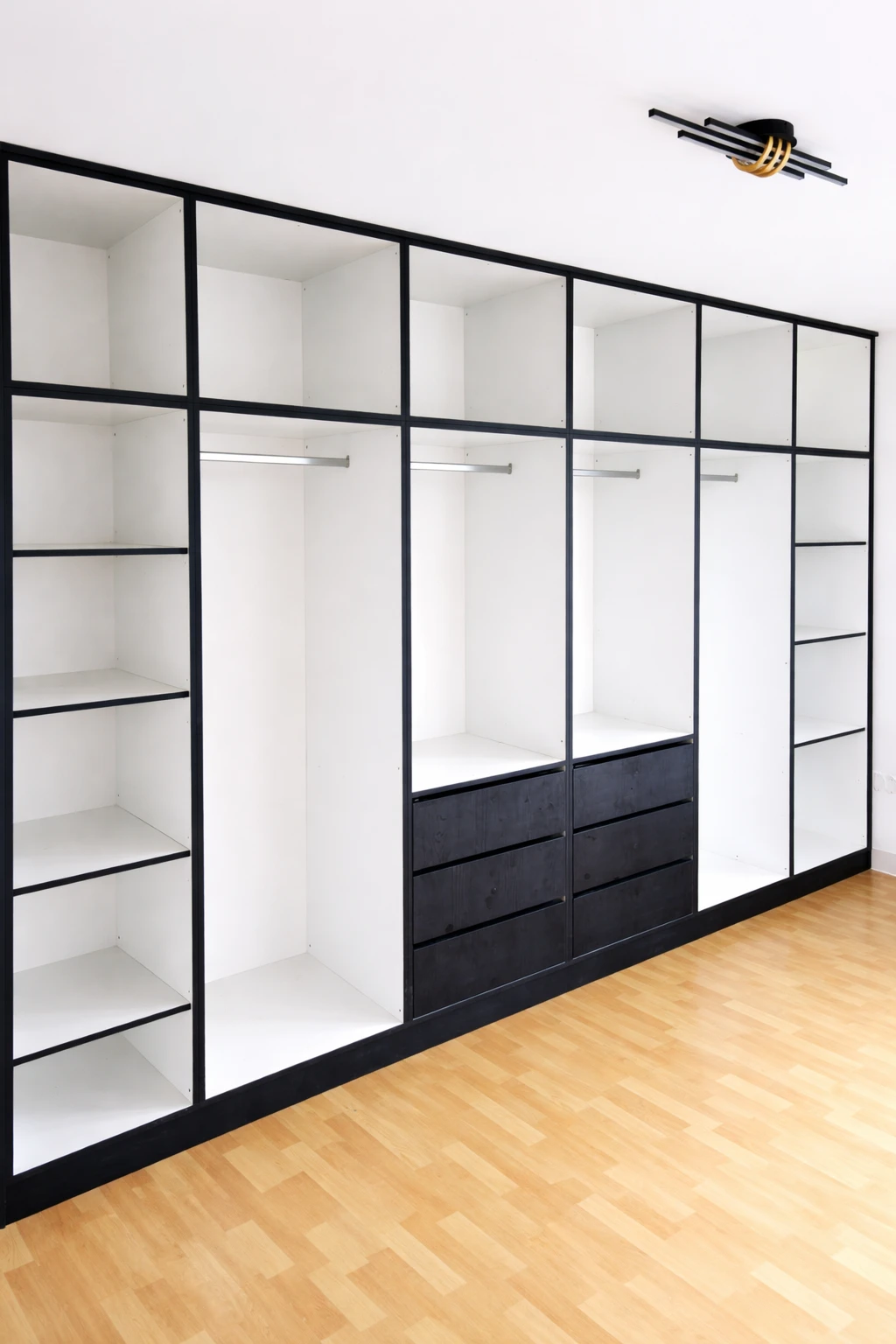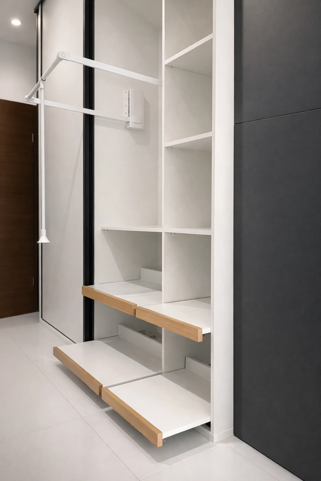 Fiókos rendszerek a kiegészítőknek, hosszú akasztós rekeszek a kabátoknak, polcok a cipőknek – minden elem pontosan oda kerül,